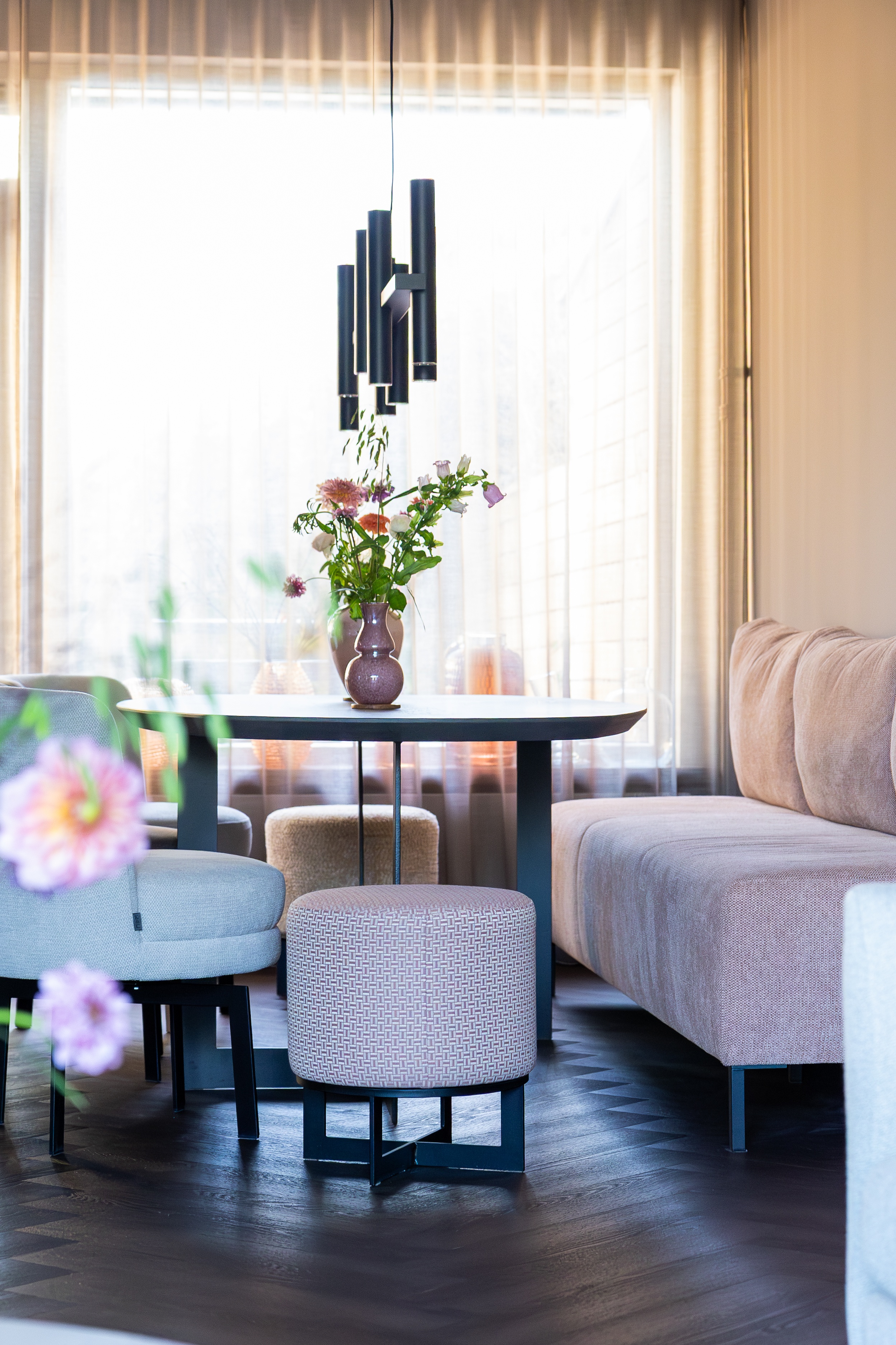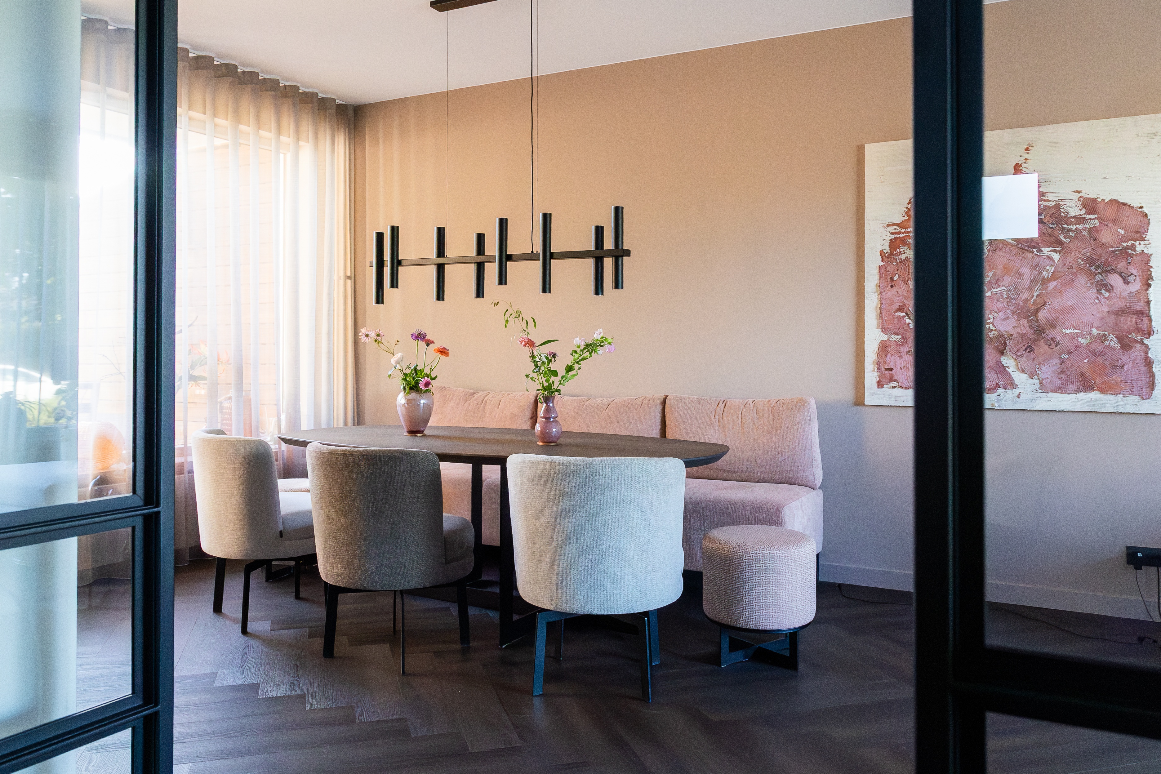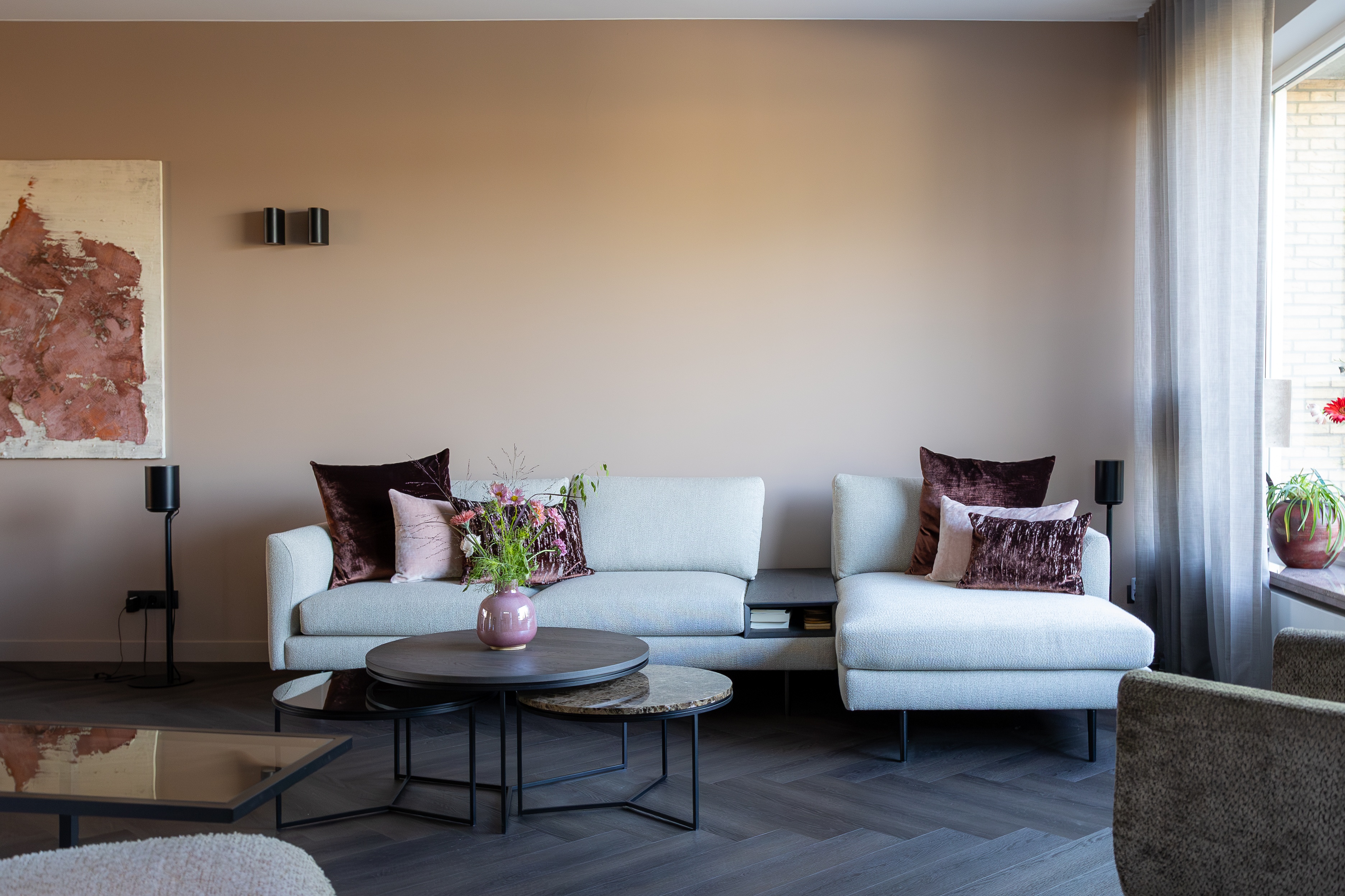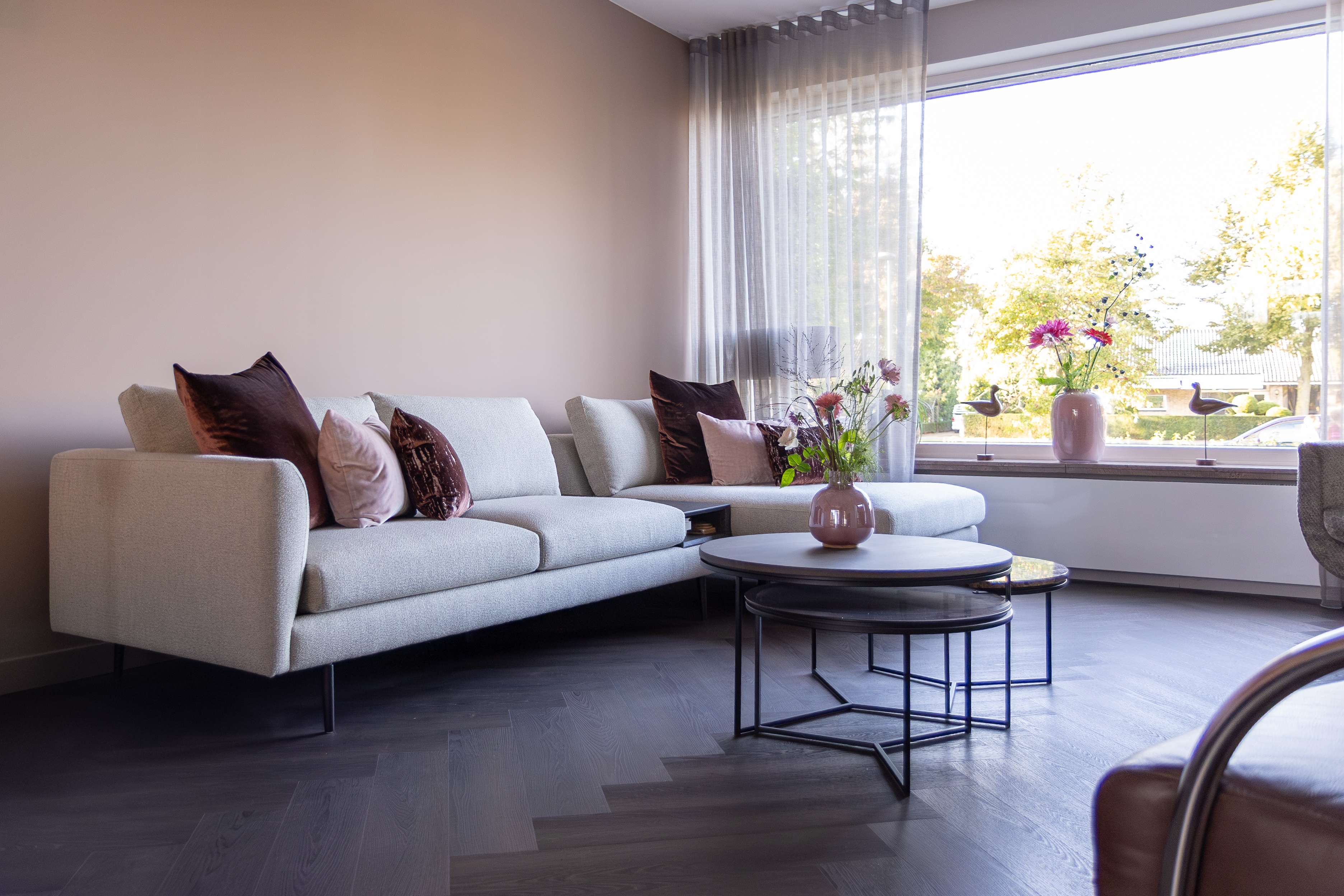 De comfortabele hoekbank samen met de aparte zithoek – twee fauteuils in een zachte stof – maken de ruimte helemaal compleet. Warme basistinten met roze accenten brengen gezelligheid, terwijl de zwarte details in verlichting, stalen deuren en accessoires juist zorgen voor een chique touch.
