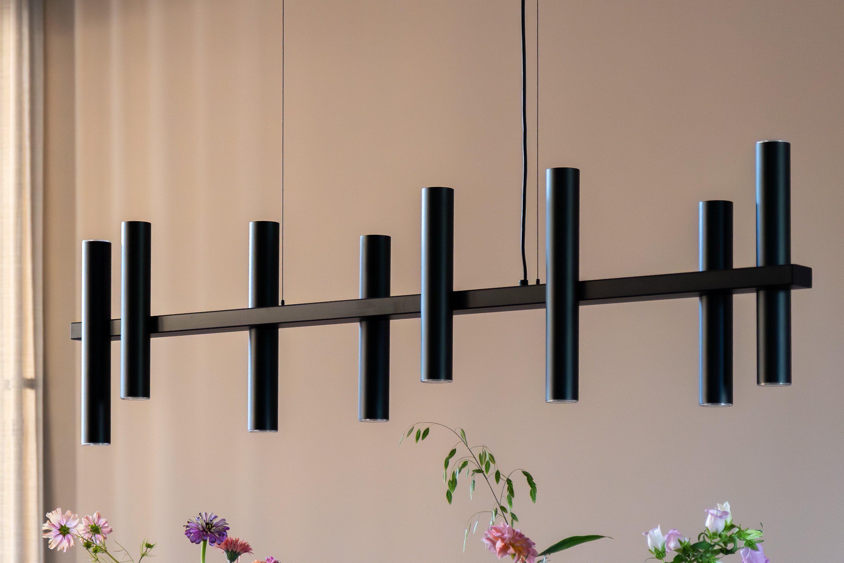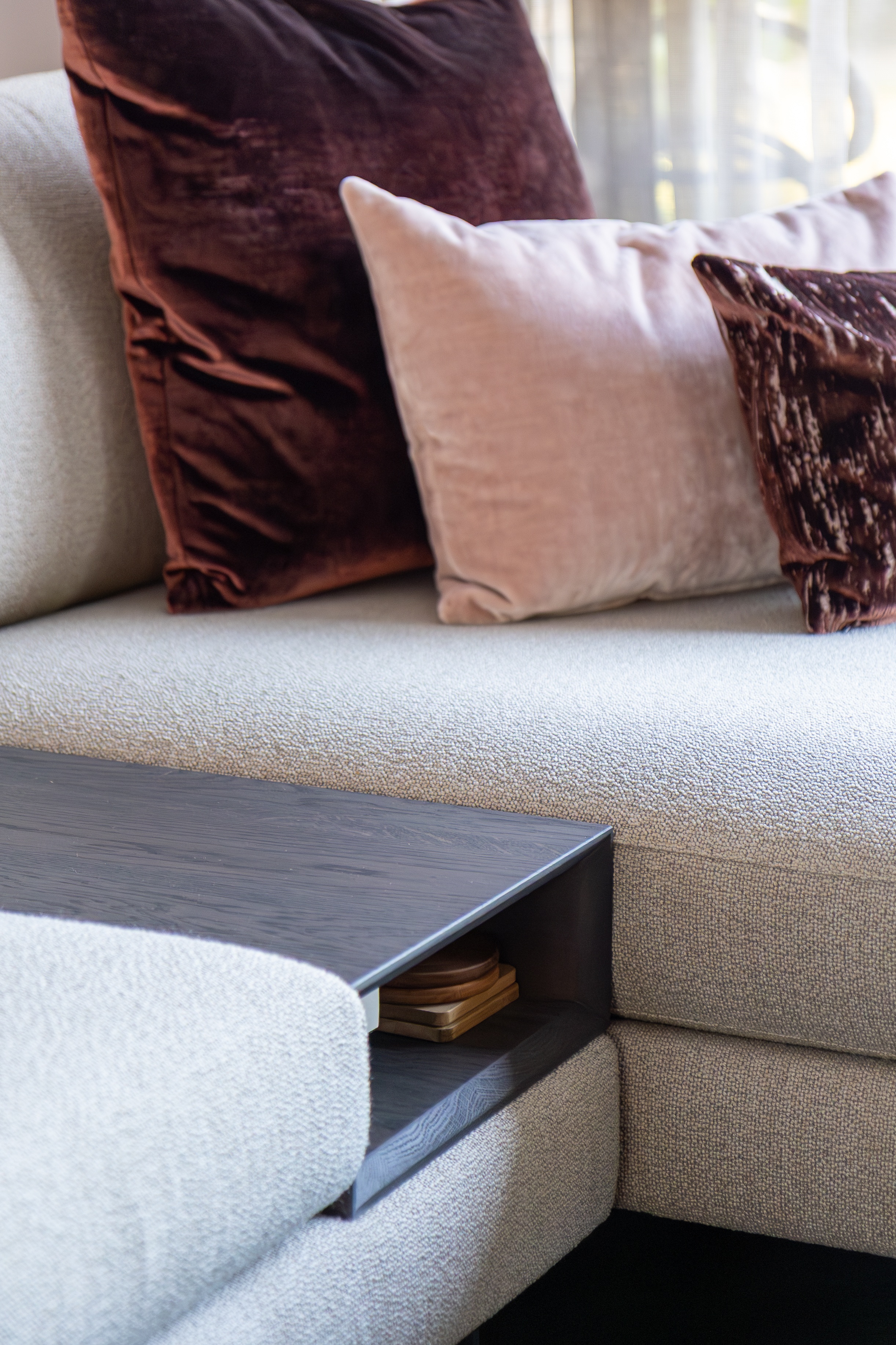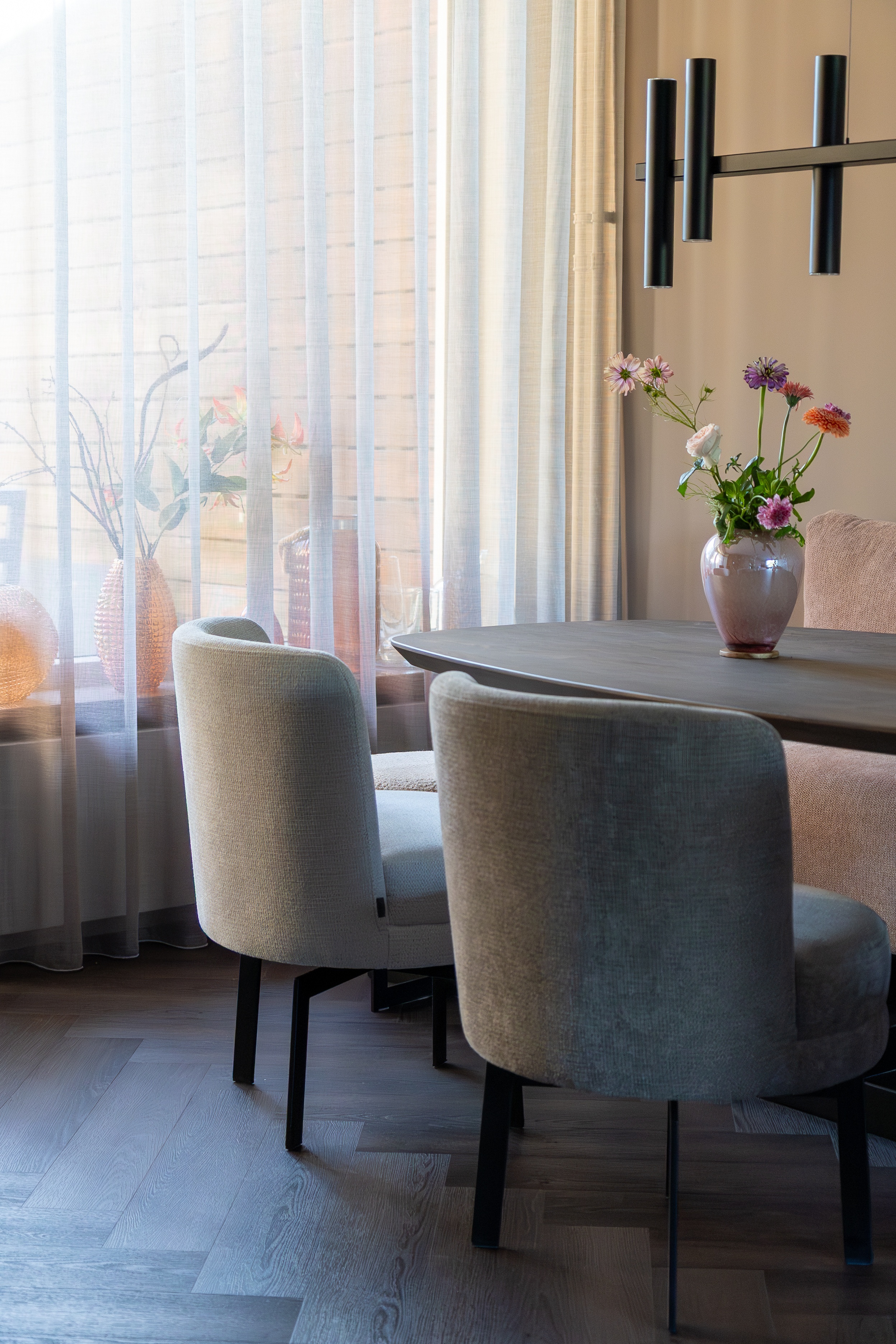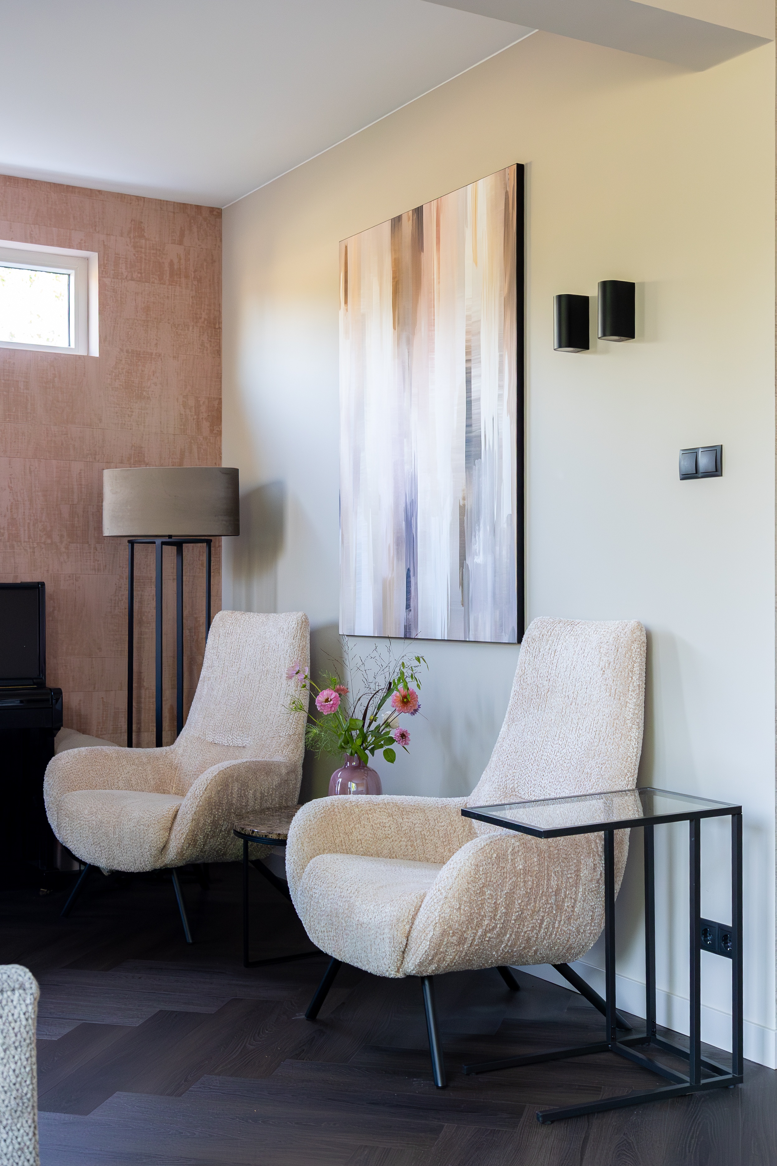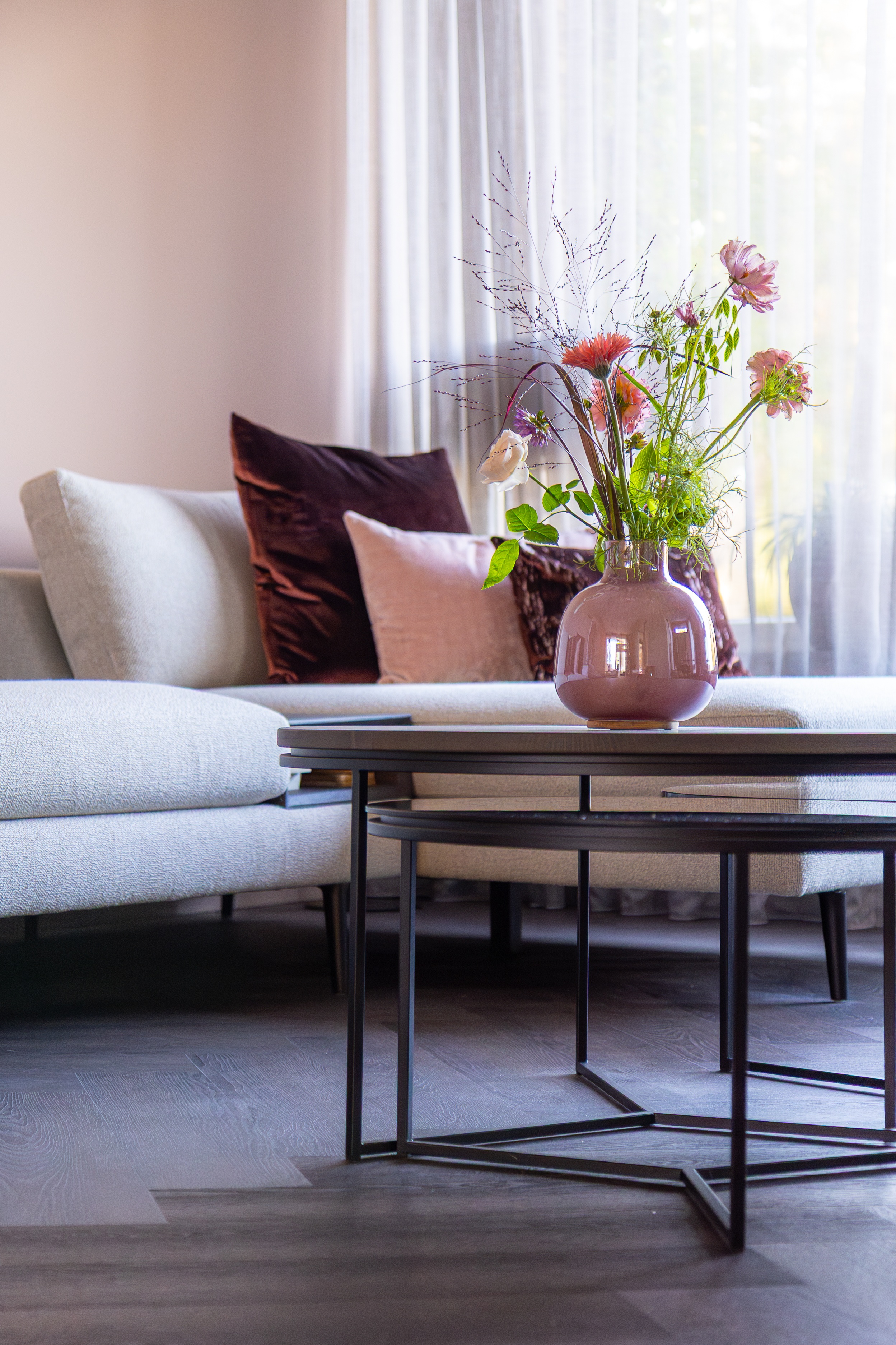 De comfortabele hoekbank samen met de aparte zithoek – twee fauteuils in een zachte stof – maken de ruimte helemaal compleet. Warme basistinten met roze accenten brengen gezelligheid, terwijl de zwarte details in verlichting, stalen deuren en accessoires juist zorgen voor een chique touch.