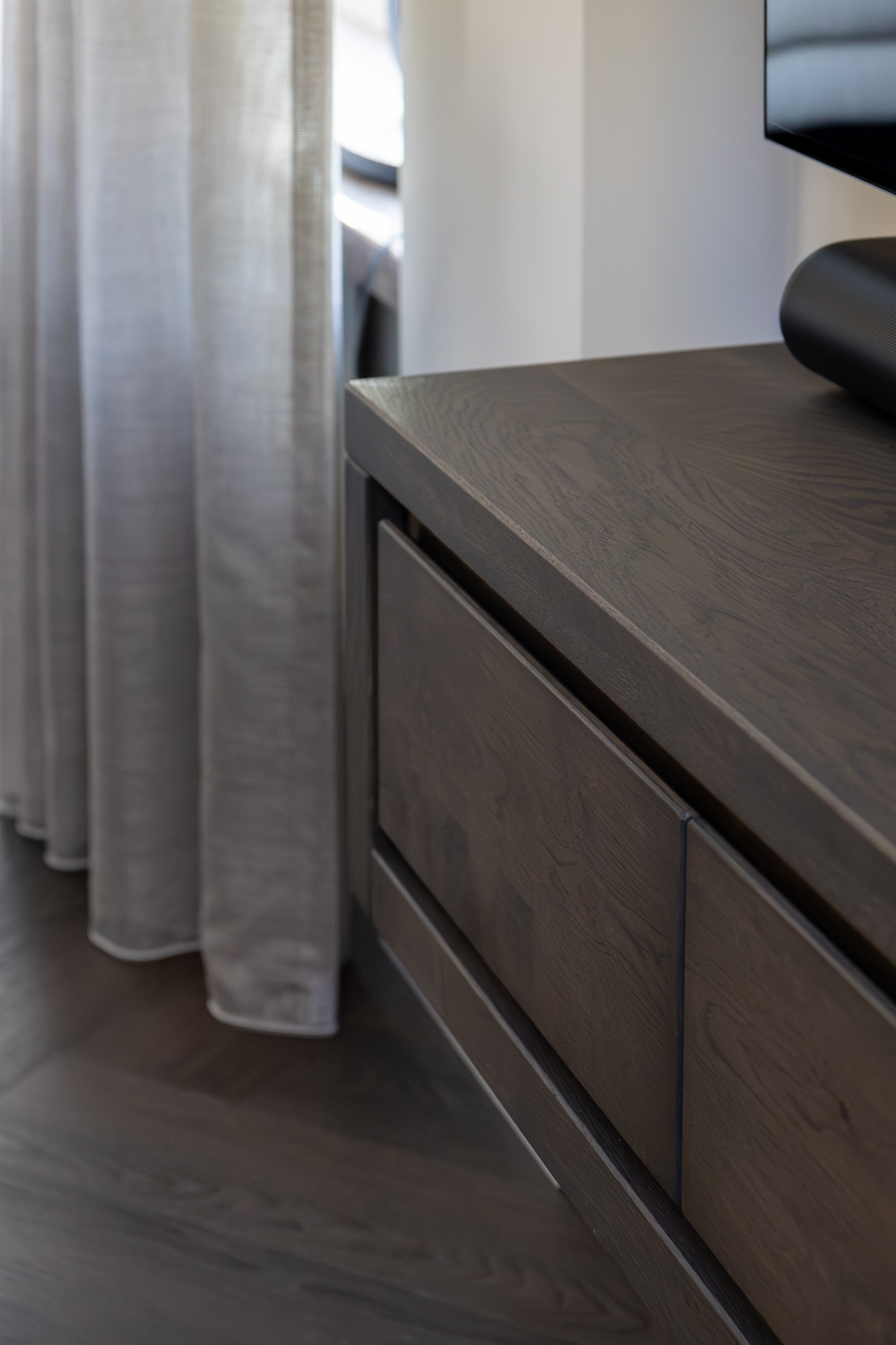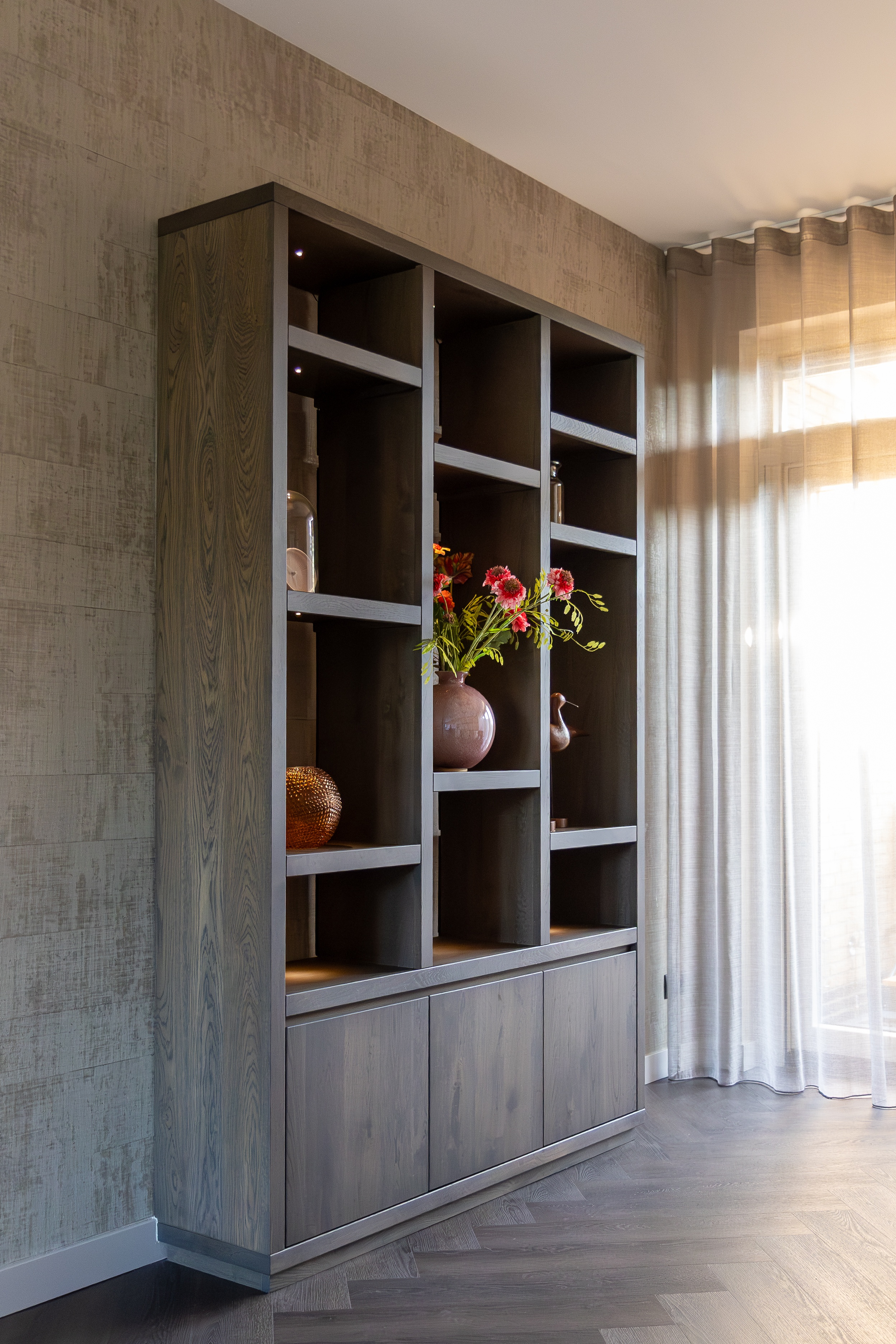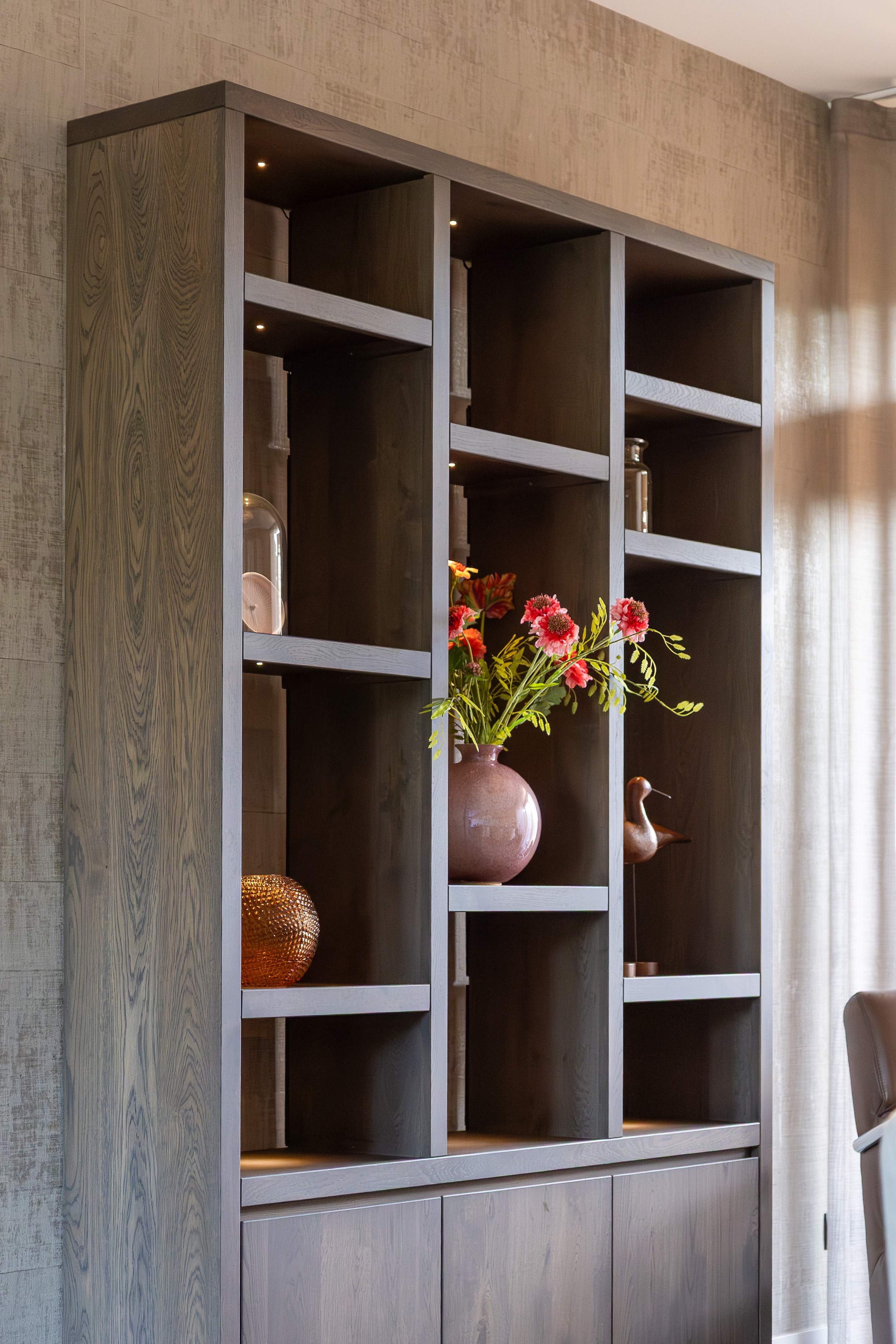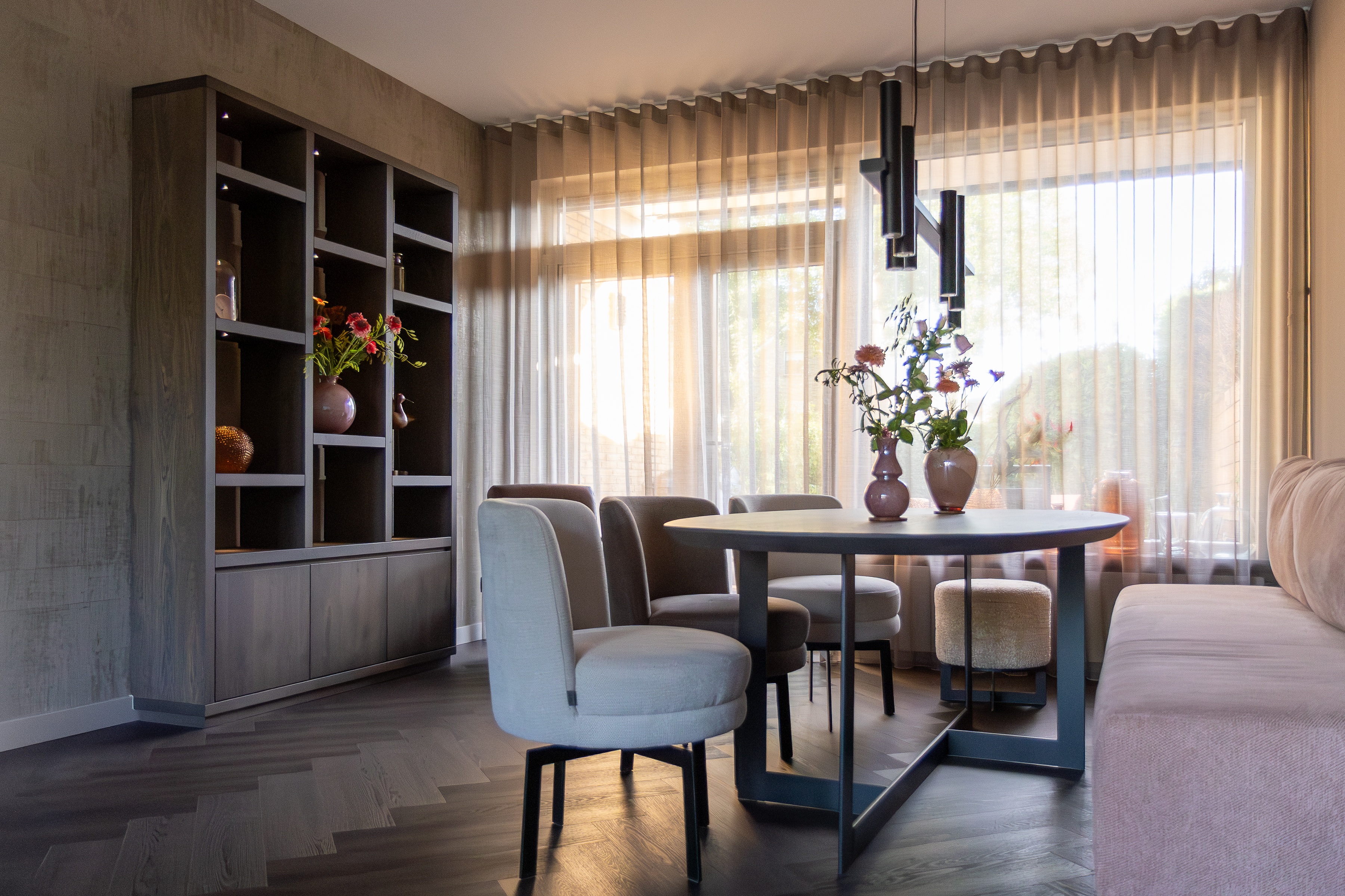 In deze woon- en eetkamer draait alles om maatwerk. De royale Deens ovale eettafel met een zachte eetbank en stijlvolle fauteuils nodigt uit om uren aan te tafelen. De ruime kast met ingebouwde spots geeft extra sfeer én is praktisch door de dichte onderkasten.